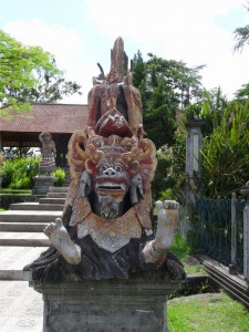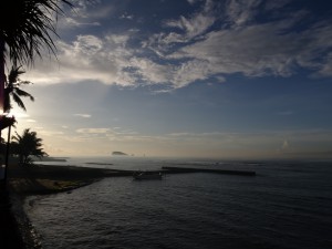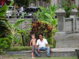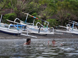 Der Ort an dem wir absteigen, Candidasa, hat durch das Wegsprengen der vorgelagerten Korallenriffe Anfang der 80er Jahre (die Korallen wurden für das Errichten der Hotelbauten verwendet) die ehemals traumhaften Sandstrände verloren, da die Wellen ungebremst Stück für Stück den Strand weggespült haben – welche Ironie des Schicksals – und was das Meer sich nicht geholt hat, wurde nach Singapur verkauft, um dort künstliche Strände aufzuschütten. So haben die Bewohner und Hotels an der Ostküste Balis mehr verloren als gewonnen, da sich nicht mehr viele Touristen an der strandlosen und nun mit Betonbarrieren geschützten Küste aufhalten mögen. Wir wussten das und sind umso mehr erfreut, wie schön es trotzdem hier ist, vom überall rumliegenden Müll außerhalb der Anlage mal abgesehen.