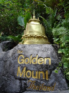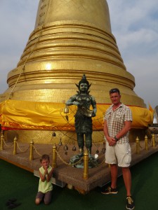Danach geht es auf den Golden Mount. 344 Stufen müssen wir bis zum Tempel erklimmen und kommen ziemlich erschöpft oben an. Die feuchte Hitze macht uns unausgeruhte Erwachsene heute ziemlich fertig. Xavi steckt natürlich alles wieder mit links weg und ist gut drauf.