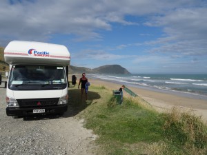 Am späten Nachmittag, nach unfreiwillen Pausen wegen schwerer Orkanböen, die mich auf die Gegenfahrbahn gebracht und meine Nerven arg strapaziert haben, erreichen wir unser nächstes Ziel am Cape Kidnappers, an der Ostküste zwischen Hastings und Napier. Ein Parkplatz direkt am Strand. Hier schließt Xavi seine nächste innige Freundschaft, diesmal mit einem Hund, Cesar ist ein süßes Vieh und seine Besitzer, ein Pärchen aus der „Nachbarschaft“, sind ebenfalls sehr sympathisch. Sie sind mit einem riesigen umgebauten ehemaligen Linienbus auf dem Platz und laden uns ebenfalls auf Wein und heiße Schokolade in ihr irres Gefährt ein. Es gibt unglaublich viele dieser alten Busse, die als ‘home on wheels’ gerade von älteren Leuten kreuz und quer durchs Land gefahren werden. Wir bekommen hilfreiche Tipps und unterhalten uns gut.