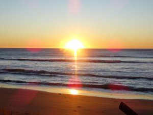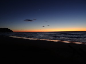 Nach zwei Nächten dort geht es weiter nach Gisbourne, an den östlichsten Punkt, wo die Welt als erstes den Sonnenaufgang erlebt. Kurz hinter der Stadt finden wir einen Schlafplatz auf einem Parkplatz an einem fantastischen Surfstrand. Das Meer übertönt den Straßenlärm von den nervigen Logging Trucks, die mit gefühlten 150 km/h im Akkord die Straße hinter uns rauf und runter rasen. Xavi surft, wir baden. Am nächsten Morgen genieße ich das Sonnenaufgangsspektakel.