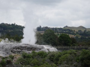 In Rotorua machen wir mal ein richtiges Touriprogramm und besuchen ein Maoridorf mit ausgiebiger und tatsächlich auch sehr interessanter Führung sowie anschließender Tanzdarbietung. Die heißen Quellen und Geysire in unmittelbarer Umgebung, die die Maori zum Kochen, Waschen und Baden nutzen, sind schon spektakulär. Nirgendwo auf der Welt ist die Erdkruste dünner als hier, nur fünf Kilometer. Der Boden des gesamten Areals ist total warm und es gibt überall blubbernde Schlammlöcher und dann wieder, direkt daneben,  kristallklare und türkis schimmernde heisse Seen, aber, allgegenwärtig der intensive Schwefelgeruch. Wie man damit leben kann, bleibt ein Rätsel…