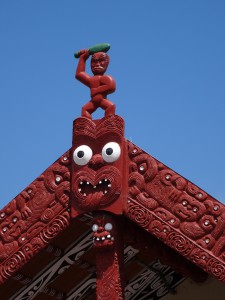 Der Dachfirst des Marae von Whakarewarewa – das in jedem Ort in Neuseelands zu findende Versammlungshaus der Maori