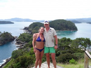 weiter nach Russell, dem ehemaligen Höllenloch des Pazifiks. Hier trieben die Walfänger ihr Unwesen. Heute kaum mehr vorstellbar, denn dieser Ort mutet fast ein wenig mondän an. Ein wunderschönes Panorama, gediegene Häuschen, schöne Yachten. Am nächsten Morgen starten wir dann unsere lang ersehnte Segeltour mit einem Katamaran durch die Bay of Islands. Bottlenose Delphine begleiten uns eine lange Zeit. Es ist ein bewegendes Schauspiel diese Tiere so nah zu sehen. Da sie Jungtiere dabei haben, dürfen wir leider nicht mit ihnen schwimmen, aber trotzdem ist es fantastisch. Wir ankern in der Bucht einer der schönsten Inseln, schnorcheln zwischen den Felsen und besteigen den höchsten Punkt, der einen grandiosen Ausblick bietet. Ein wunderbarer Trip! Zum Lunch an Bord gab es gegrillte Würstchen, Salat und natürlich lecker Weinchen..
